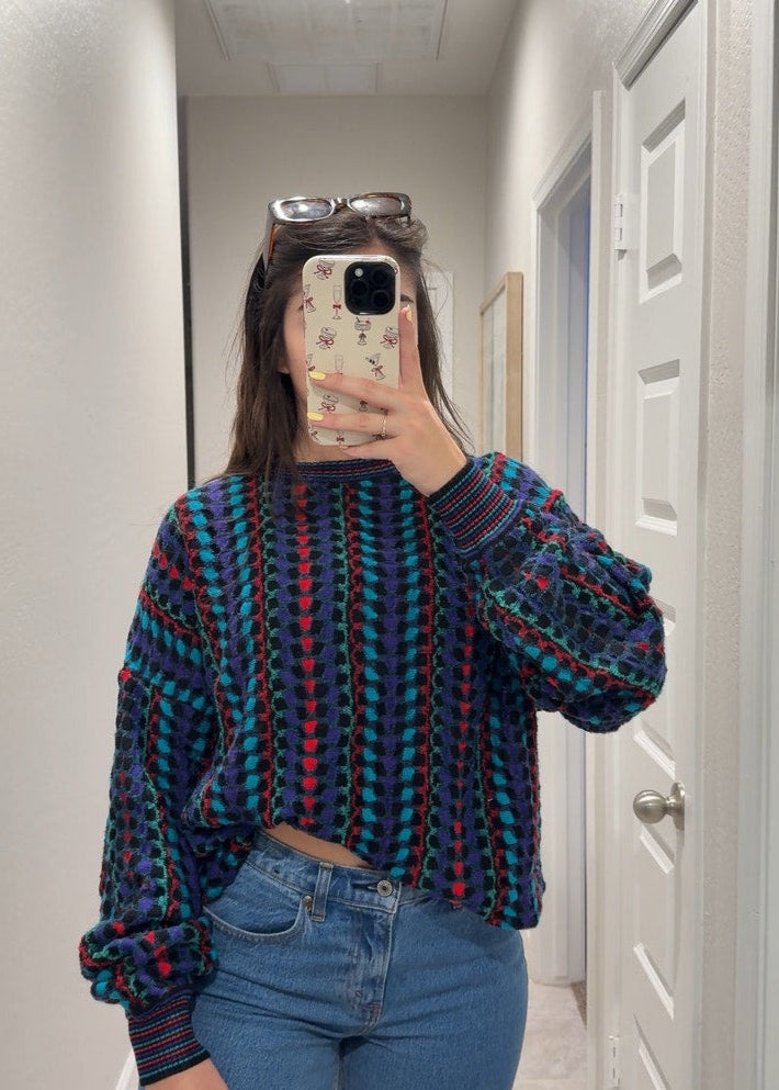- multicolor knit style with striped cuffed sleeves